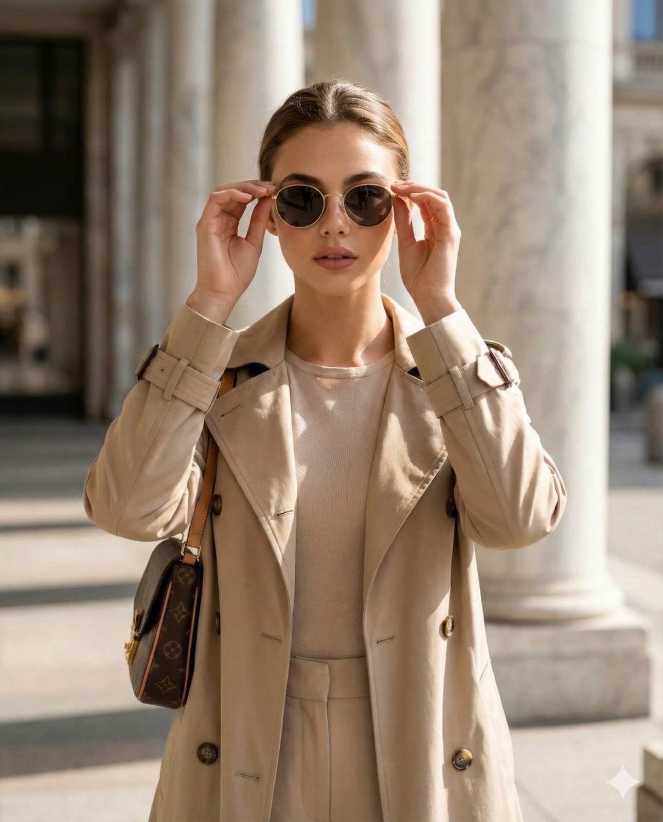 Create an outdoor fashion portrait using the uploaded reference image with absolute identity lock. The woman’s face must be an exact, unchanged match to the reference image. Preserve 100% fidelity to her facial features, facial structure, bone structure, proportions, natural skin tone, skin texture, pores, makeup style, expression, eye shape, nose, lips, jawline, and overall physiognomy. No beautification, no stylization, no age shift, no facial reshaping, no proportion changes, no symmetry correction. Identity must remain perfectly unchanged. Depict the same woman captured in a medium close-up, eye-level shot, standing confidently in an urban architectural setting. She is calmly adjusting round, stylish sunglasses with both hands near the temples. Her expression is composed, confident, and self-assured, fully consistent with the reference image. Her hair is tied back neatly, with a smooth, clean texture, matching the reference hairstyle exactly in color, density, and finish. Wardrobe & Accessories A beige coat layered over a light beige top High-waisted trousers, tailored and elegant A luxury designer handbag with a patterned surface and gold hardware, worn naturally on the shoulder All clothing and accessories must be realistically scaled and worn without altering body proportions. Environment Tall marble or stone columns with clean architectural lines Urban luxury setting Background softly softened (natural depth of field) to maintain focus on the subject Lighting & Mood Strong natural sunlight Crisp highlights and defined shadows Sharp detail on skin and fabric Bright, modern city atmosphere Visual Style High-end luxury street-fashion aesthetic Ultra-realistic textures Clean, balanced color tones High visual clarity and editorial polish Strictly avoid: any facial or hair alteration, identity drift, artificial skin smoothing, exaggerated beauty effects, distorted anatomy, unrealistic lighting, over-saturation, stylized or painterly looks, blur on the face, low resolution, noise, artifacts, watermarks, logos, or text.