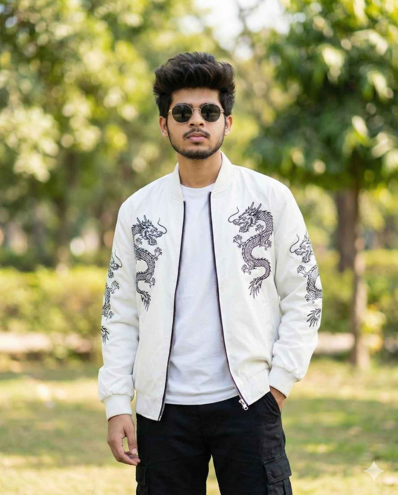 Ultra-realistic outdoor portrait using the exact same face from the uploaded reference image, with absolute identity preservation. DO NOT CHANGE THE FACE. The facial identity must remain 100% identical to the reference image with zero alteration to facial structure, proportions, age, expression, emotion, skin tone, skin texture, facial hair, or any identity-defining features. Preserve the original facial shape, bone structure, eyes, nose, mouth, and natural skin details exactly as shown in the reference. A stylish young man wearing dark sunglasses stands outdoors in a park-like setting. He has identity-consistent dark hair, maintaining the same hairline, density, texture, and grooming as the reference image. His pose is confident and relaxed, cool and composed, with one hand casually placed in his pocket. Outfit: A white jacket (bomber-style) featuring intricate black dragon embroidery, worn over a clean white undershirt. Black pants (cargo or tailored streetwear fit), realistic fabric textures and natural folds. Environment & Background: Outdoor setting with a softly blurred green background of trees and foliage, creating a natural bokeh effect. Lighting & Style: Bright, natural daylight illuminating the subject evenly, highlighting textures and details without harsh shadows. True-to-life colors, no filters, no stylization. Ultra-realistic, high-resolution photography look with shallow depth of field for a modern, polished outdoor portrait.