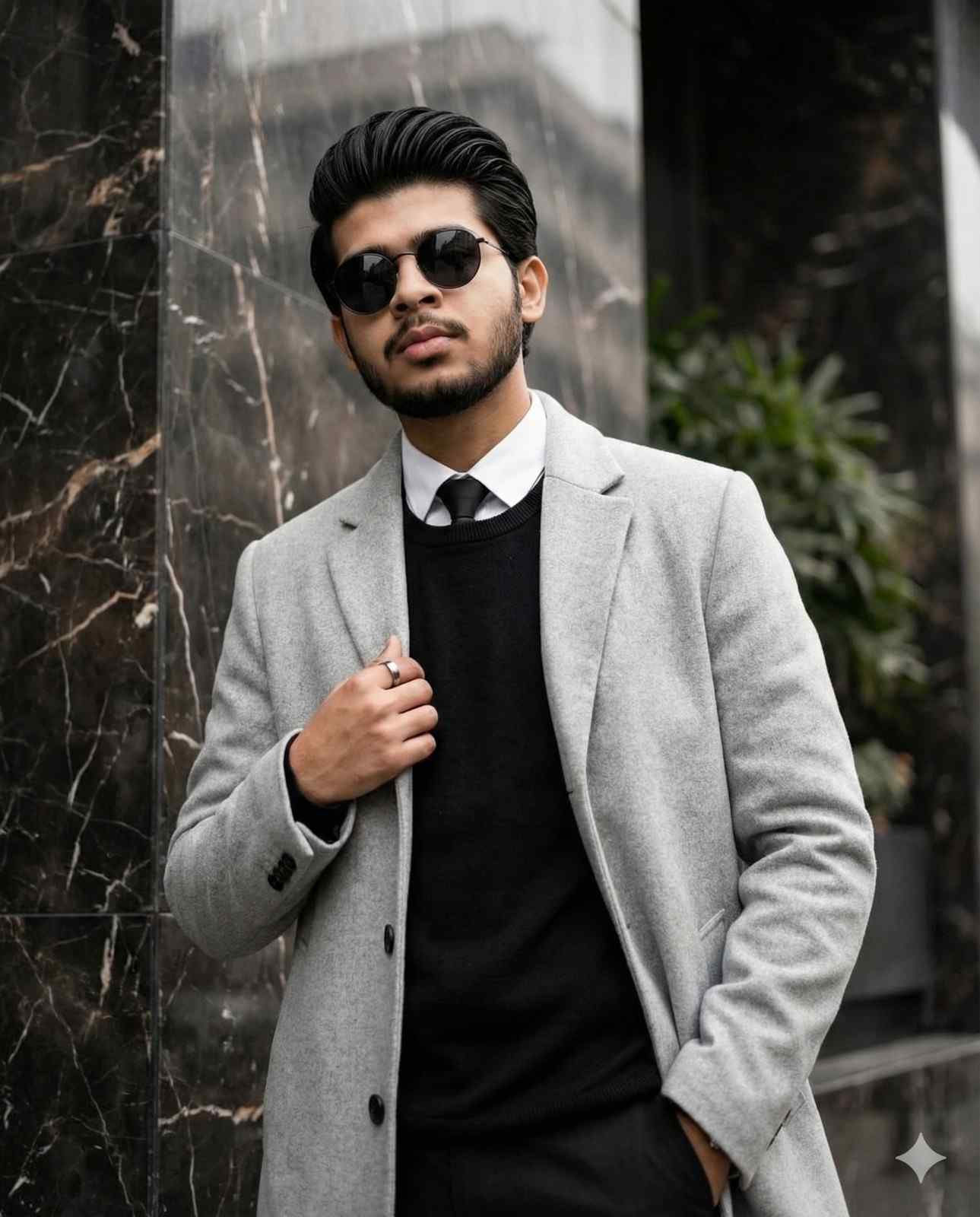 Make A stylish man use image for face reference with a neat beard and slicked-back hair is captured in a low-angle, medium-close outdoor shot. He wears dark sunglasses, a light grey overcoat over a black sweater, white shirt, and slim black tie. One hand grips his coat, the other rests in his pocket, showing confidence. A ring is visible on his left hand. The dark, urban marble backdrop with light veining and subtle greenery adds a modern, luxurious vibe. Lighting is soft, enhancing textures and contrast.