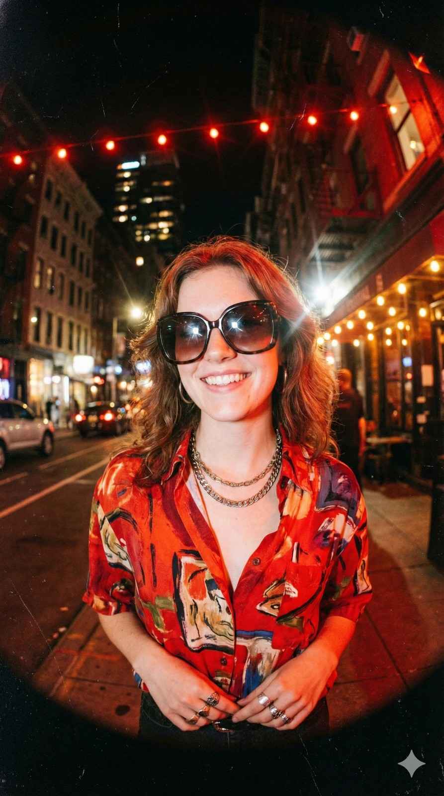 A vertical high-resolution 8K vintage style flash photograph of a stylish white women (use the first uploaded image reference the face) standing confidently on a nighttime city street, captured with dramatic fisheye lens distortion. The image includes subtle grain, light film scratches, and analog texture effects for a nostalgic yet editorial feel. She wears an abstract red shirt with bold, expressive artistic patterns, partially unbuttoned to reveal his confident, edgy demeanor. Chunky metallic jewelry and fashionable sunglasses add to his striking streetwear aesthetic. The city backdrop is softly transformed by cozy home party vibes red ambient lighting, delicate string lights hanging above and a warm, intimate atmosphere that blends festivity with the urban night setting. Skin texture is flawless, lighting is dramatic with soft shadows and lens flash reflections. No distortions, no anatomical flaws. Image must be generated entirely based on the uploaded photo, maintaining all the characteristics of the main character.